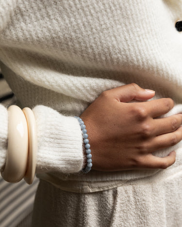 A real eye catcher! The blue sky bead bracelet, with silver closing. Looking for another colour? What about a bracelet in the colour dark wood, sand or moon? The jewellery collection comes in a beautiful linen pouch, which will makes a perfect gift.