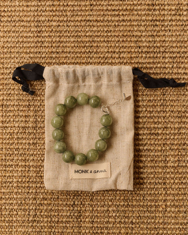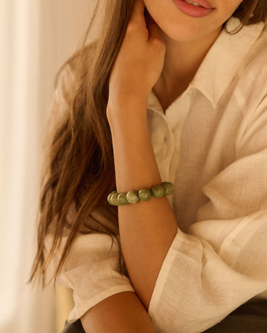 A peridot bead bracelet, with silver closing. The jewellery collection comes in a beautiful linen pouch, a perfect gift!