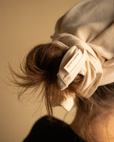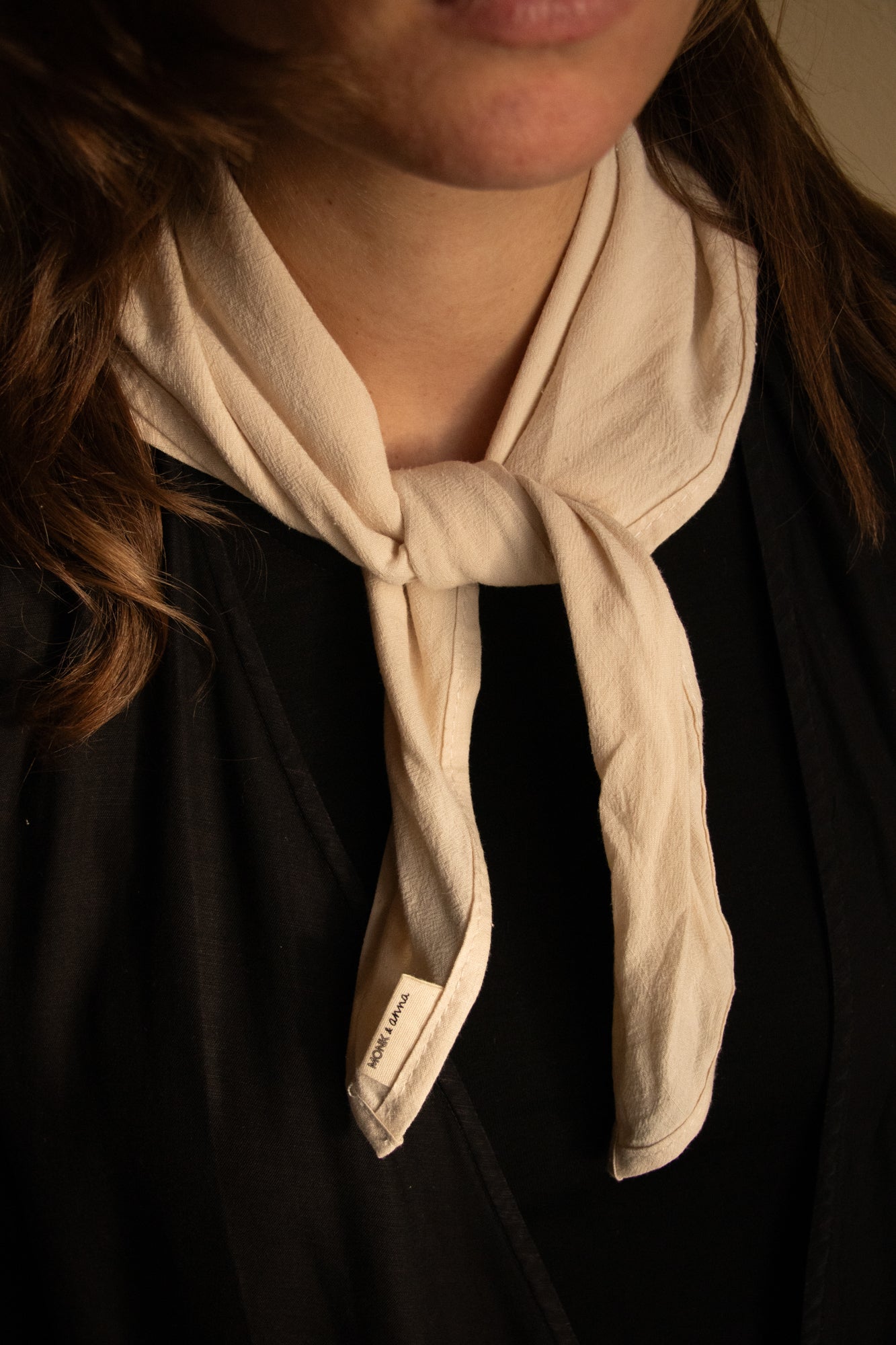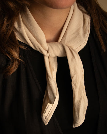 A square cut cotton hair scarf packed in a tin. Wear it as a headband, fold it in your hair or wrap it around your neck.