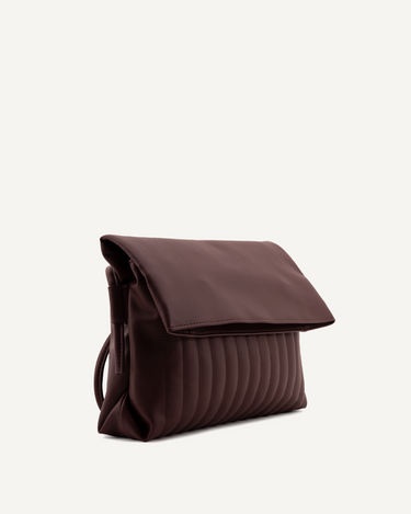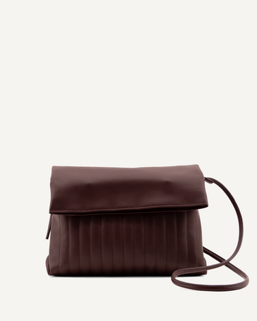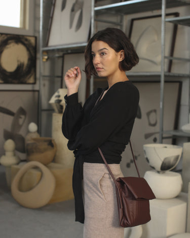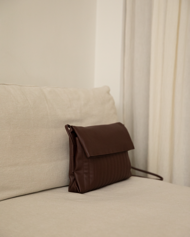 The kitarō shoulderbag comes with a flap closure and two compartments. The front compartment has a zipper puller and the back compartment can be reached by unfolding the flap closure. The bag is made of high quality padded vegan leather, with a black YKK zipper and a linen lining. An extra pocket can be found on the inside of the back compartment.