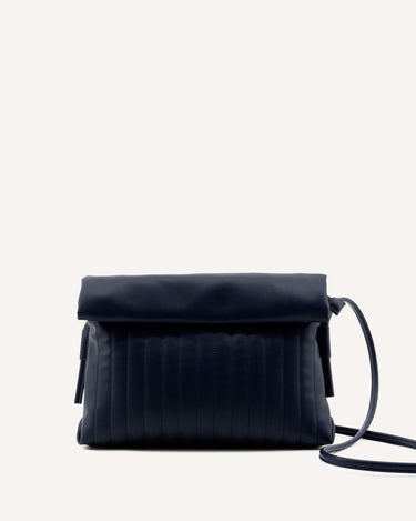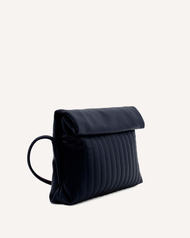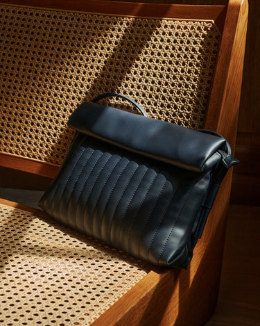 The kitarō shoulderbag can be rolled up and has two compartments. The front compartment has a zipper puller and the back compartment can be reached by unfolding the rolled up closure. The bag is made of high quality padded vegan leather, with a black YKK zipper and a linen lining. An extra pocket can be found on the inside of the back compartment.