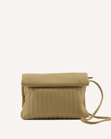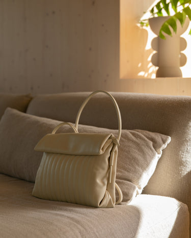 The kitarō shoulderbag can be rolled up and has two compartments. The front compartment has a zipper puller and the back compartment can be reached by unfolding the rolled up closure. The bag is made of high quality padded vegan leather, with a black YKK zipper and a linen lining. An extra pocket can be found on the inside of the back compartment.