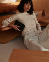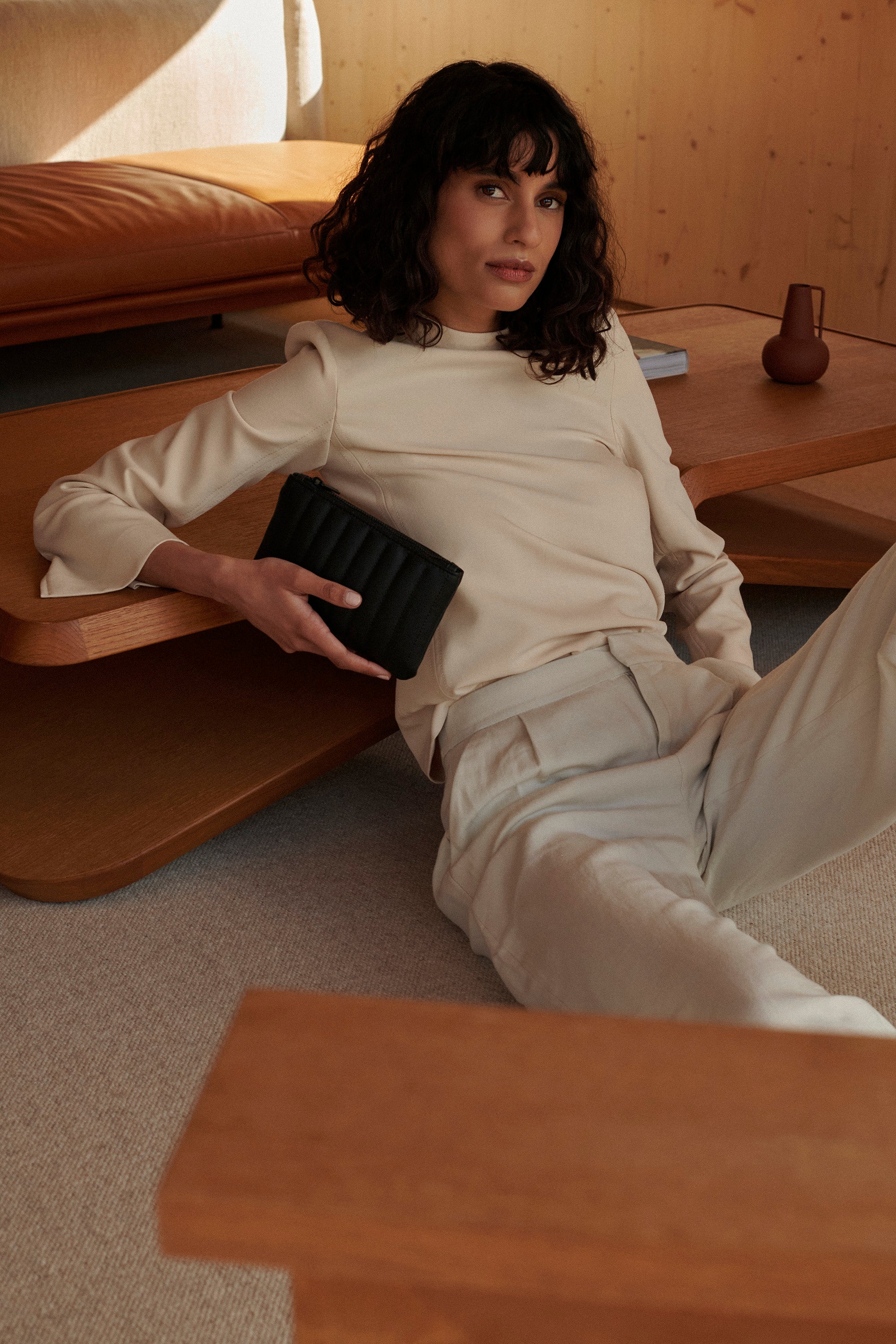 The michi wallet, a rectangle shaped wallet with a padded design. The wallet closes with a zipper