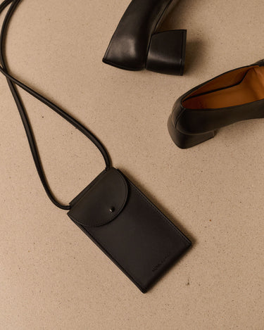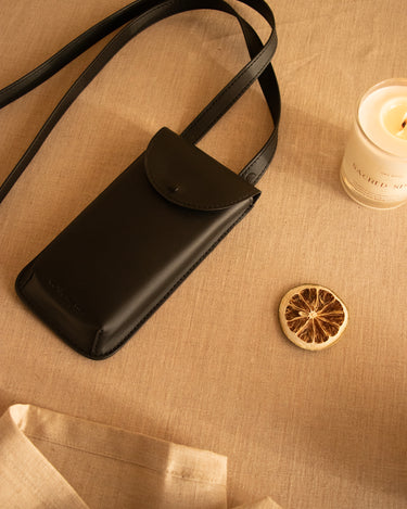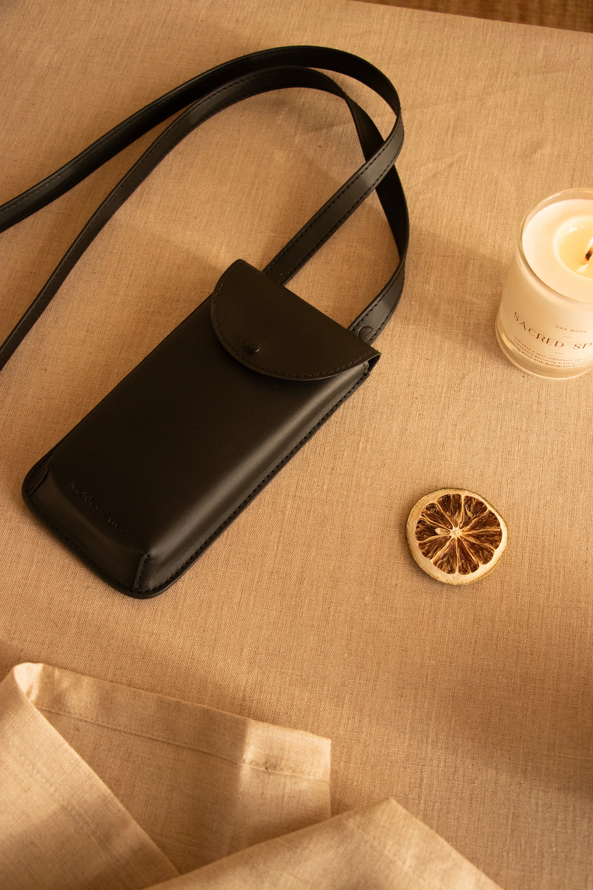 Keep your phone and essentials close by, all being fashionable at the same time.The phone pouch closes with a magnet closure and has space for three cards in the back.