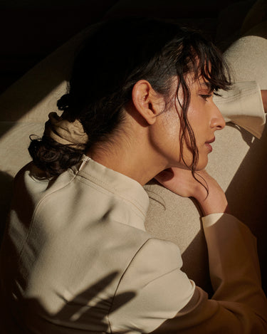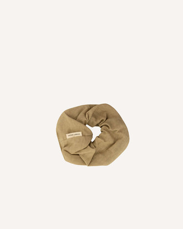 A linen scrunchie with an elastic band on the inside, so you can wear the scrunchie easily in your hair.