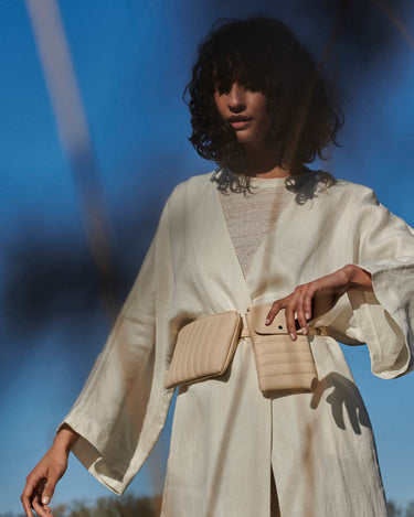 The yuki belt bag has an attachable wallet and phone pouch. This belt bag is made of high quality vegan pebbled leather. The black zippers are from YKK.